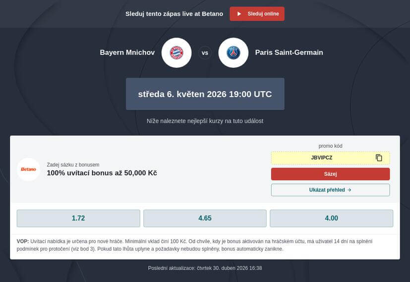 Odvetné utkání mezi Bayernem Mnichov a PSG se odehraje 6. května od 21:00 na Allianz Areně v Mnichově. Zápas bude vysílán na Nova Sport 3 nebo Nova Sport 4 a online na platformě Voyo.